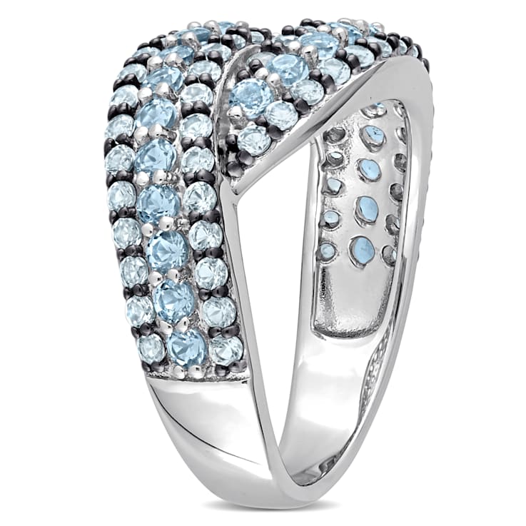 Cast a spell with this breathtaking Sky-Blue Topaz Multi-Row Crossover Ring. Mounted in flickering sterling silver, this gemstone ring features 58 round-cut(1.5x1.5mm) and 24 round-cut(2x2mmm) sparkling sky-blue topaz gemstones in shared prong setting, that are embellished on multiple rows in the swirl designed crossover band. This fashionable ring has been enhanced with a beautiful high polish finish and will complement any look. A perfect ring that you can flaunt on your right hand.