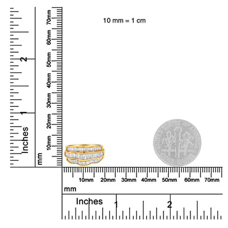 A diamond fashion band ring that is designed with three rows of baguette diamonds. The wide band is crafted in 14 karat yellow gold. The total diamond weight is 1 1/4 carats. This is a one-of-a-kind piece and will be a unique addition to your jewelry collection.