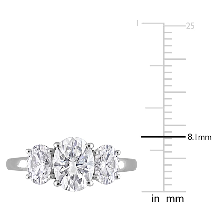 This oval-cut moissanite three-stone engagement ring is crafted in lustrous sterling silver and features three oval-cut, prong-set created white moissanite gemstones beautifully set in the center of the ring. Enhanced with a high polish finish, this fancy-cut bridal ring portrays a feminine and graceful charm to it without being overdone. This gemstone ring is an elegant addition to any jewelry collection.